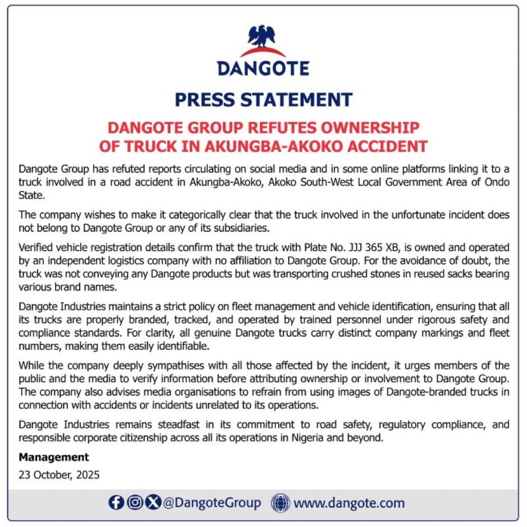 The Dangote Group has officially distanced itself from a recent fatal road…